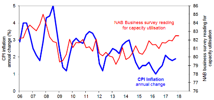 Australia’s slow wages growth, more competitive pressures in the retail sector and subdued import prices with globalisation have been key factors driving this low inflation. However there are now some signs that inflation pressures are building. The NAB Business survey shows that capacity utilisation is rising steadily (red line in chart). This utilisation measures the percentage of business capacity that is currently being employed to produce goods and services.