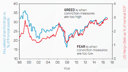 Investors’ conviction or belief in the share market can be measured by their exposure to shares and the scale of their debt. The Federal Reserve’s ‘Flow of Funds’ survey shows household shares exposure as a percentage of financial assets. Notably at the peak of the dot.com era in March 2000 (a ‘greed’ episode), US households had 36% of their financial assets in shares. This slumped to only 21% by March 2003 after the NASDAQ technology crash and the Enron and WorldCom accounting scandals (a ‘fear’ episode).