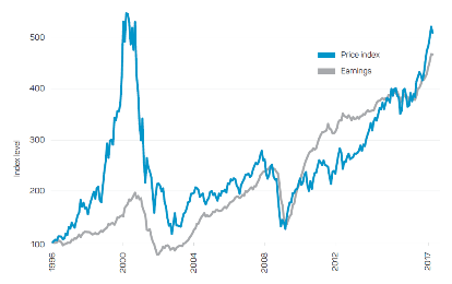 Sources: BlackRock Investment Institute, with data from MSCI and Thomson Reuters, July 2017. Notes: the price index is based on the MSCI All-Country World Technology Index. Earnings are represented by the aggregate 12-month forward earnings estimate. Both series are rebased to 100 at the start of 1996.